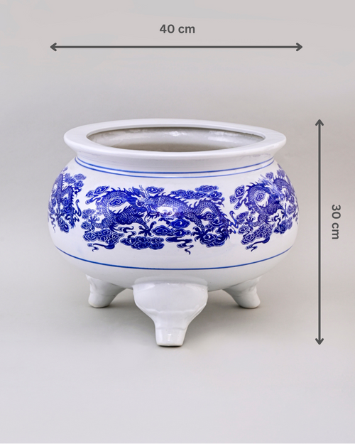 This striking porcelain planter features an elegant blue dragon motif intricately painted on a crisp white background. The round, wide-mouthed design rests on three sturdy legs, giving it both stability and a traditional ornamental charm. The dragon, a timeless symbol of strength, prosperity, and protection, makes this planter not only functional but also deeply symbolic.