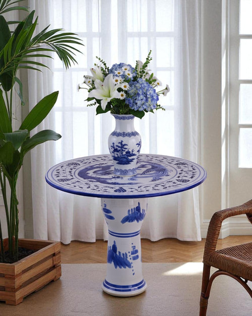Elevate your living space with the Blue & White Dynasties Hand-Painted Center Table, a masterpiece of traditional craftsmanship and timeless elegance. Featuring an intricate dragon and phoenix motif, this table symbolizes power, prosperity, and harmony, making it a statement piece for any setting. The stunning hand-painted blue floral patterns reflect the rich heritage of classic dynasties, while the smooth ceramic finish adds a touch of sophistication.