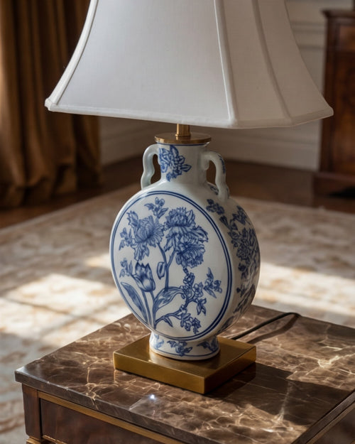 The Blue & White Floral Table Lamp features a classic white ceramic base with blue floral artwork, paired with a soft fabric shade that gives a warm, relaxing glow. Its traditional design looks great on bedside tables and side tables, adding an elegant decorative touch to both modern and classic interiors.