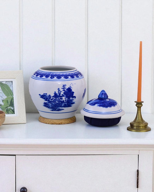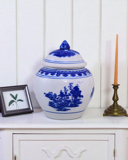 This elegant porcelain storage jar is decorated in a classic blue and white style, featuring a hand-painted scenic landscape with trees, mountains, and traditional Chinese pavilions. The detailed brushwork reflects the timeless charm of oriental artistry. The jar comes with a matching lid, topped with a pointed finial, and is accented with decorative border patterns for added refinement.