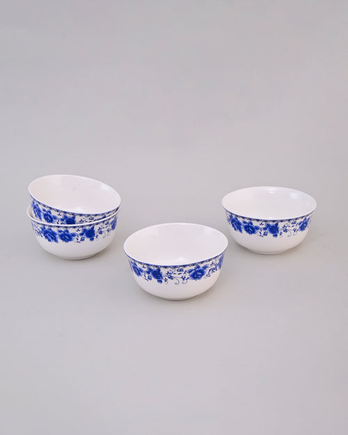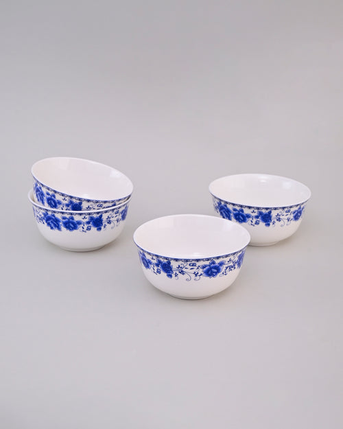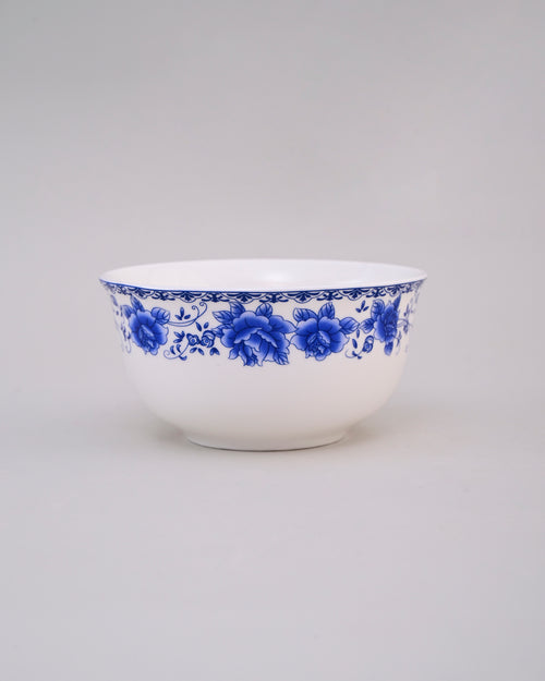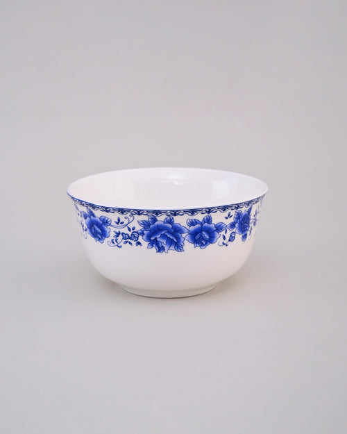 This porcelain bowl showcases a charming design with vivid blue roses encircling the rim, creating an elegant contrast against the crisp white base. Its floral detailing adds a touch of sophistication and timeless beauty. Perfect for serving meals, snacks, or as a decorative piece, this bowl brings classic artistry and elegance to any dining setting.