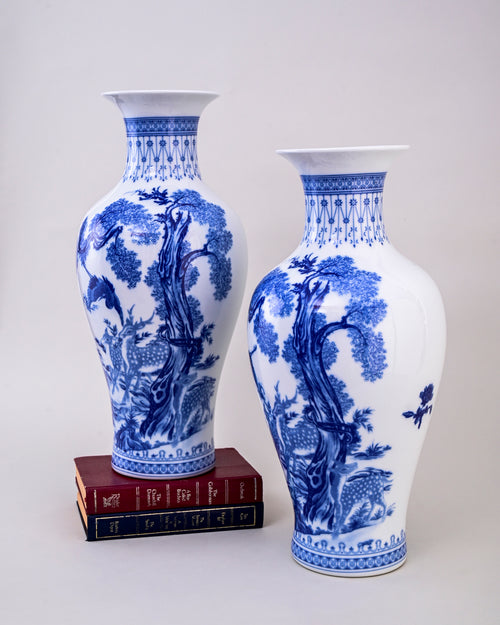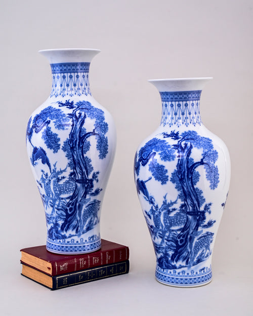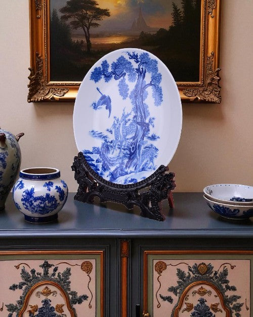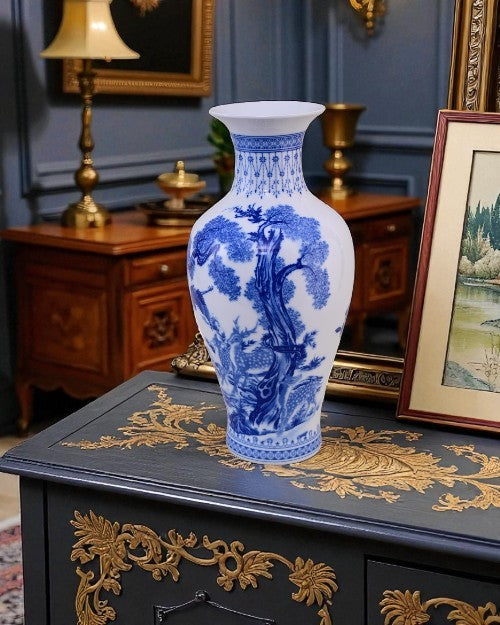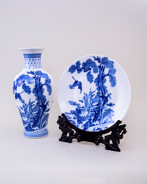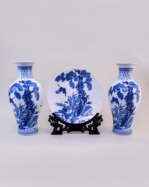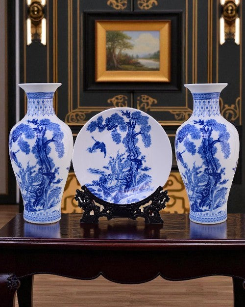 The Blue & White Serenity Landscape Vase & Decorative Plate Set showcases timeless oriental artistry with detailed tree and bird motifs in classic blue and white. This elegant ceramic ensemble adds a calming and sophisticated charm to any space, whether displayed in living rooms, hallways, or dining areas.