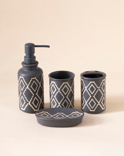 The set of 4 includes a soap dispenser, toothbrush holder, tumbler, and a soap dish.