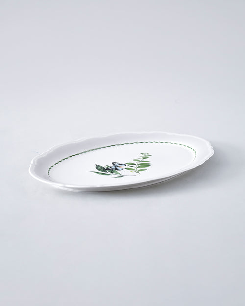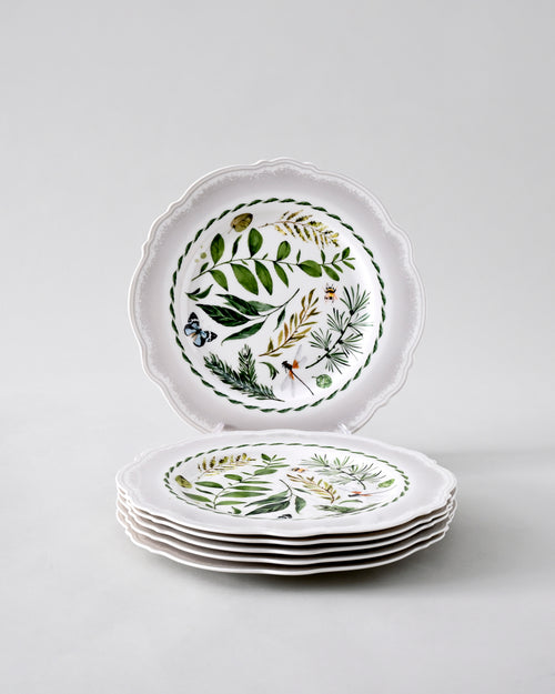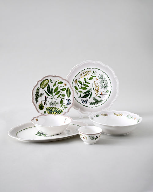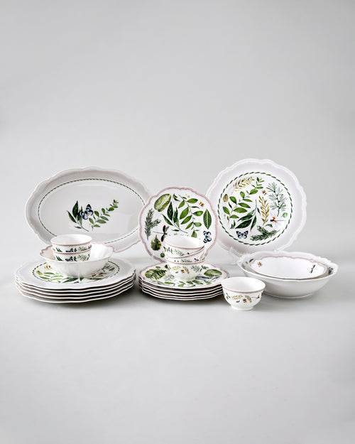 This elegant dinner set features a refreshing botanical theme with finely detailed green leaves, herbs, and delicate floral accents, bringing a touch of nature to your dining experience. Crafted from high-quality porcelain, each piece is adorned with soft earthy tones and intricate patterns that evoke a garden-like charm.