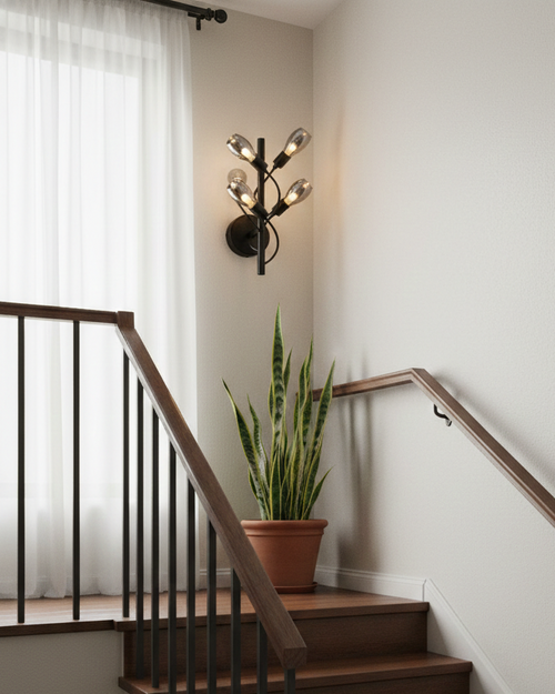 The Branvora Glow Wall Light features sculpted metal branches holding softly glowing frosted glass buds, creating an artistic, nature-inspired silhouette. Its warm ambient light adds character to living room walls, corridors, and feature panels, bringing modern elegance with a subtle decorative touch.