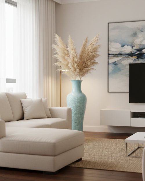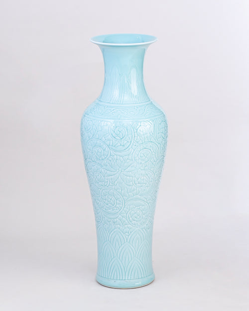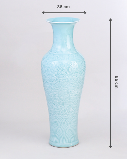 The Floral Pastel Glaze Vase With Stand boasts a tall, graceful form adorned with intricate vine and floral engravings that exude a sense of luxury and tradition. Its soft pastel glaze enhances the delicate detailing, making it a stunning centerpiece for living rooms, halls, or grand entrances. Perfect for both classic and contemporary décor, this vase embodies timeless craftsmanship and refined artistry.