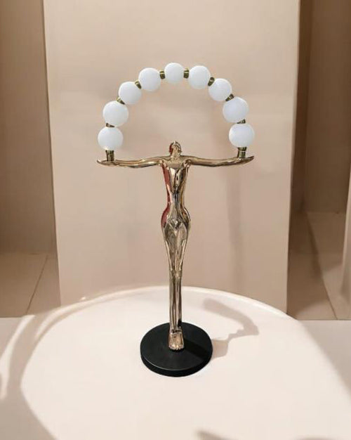 A stunning floor lamp combining art and functionality, featuring a golden humanoid figure with arms outstretched, supporting a glowing arch of spherical lights. This piece serves as both a lighting fixture and a contemporary sculpture, perfect for adding sophistication and personality to any interior space.
