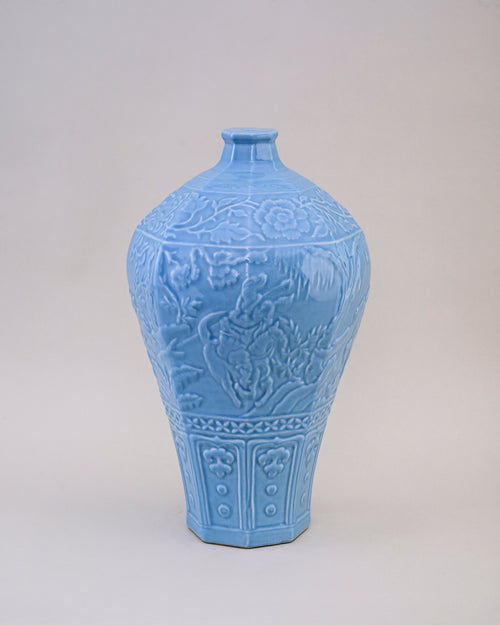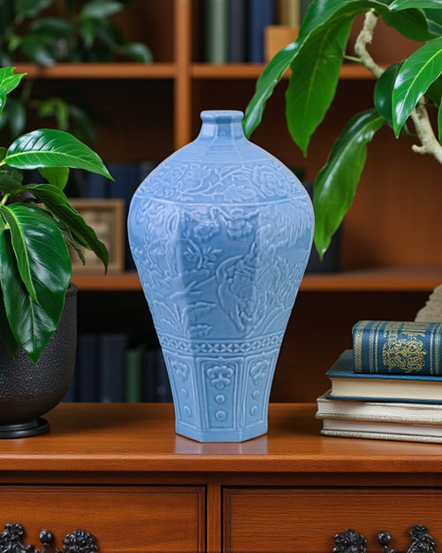 The Antique Embossed Porcelain Floor Vase features a tall hexagonal shape with beautifully carved floral and cultural motifs, highlighted in a glossy turquoise finish. Perfect for enhancing corners, entryways, or living room spaces, this vase makes a bold statement with its majestic design.