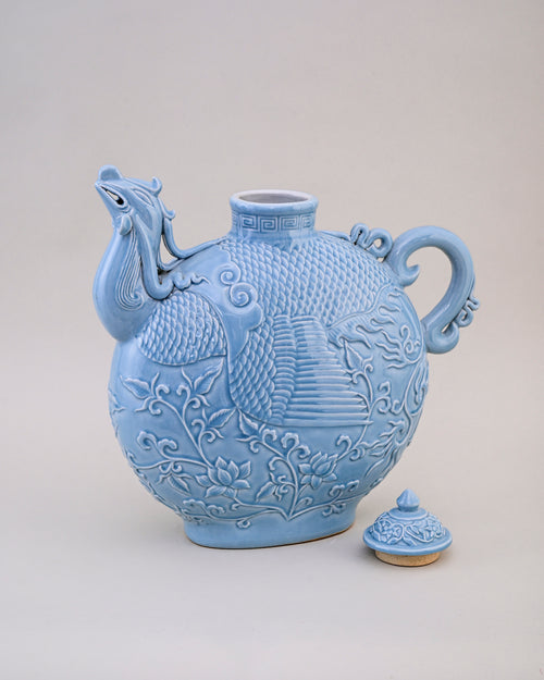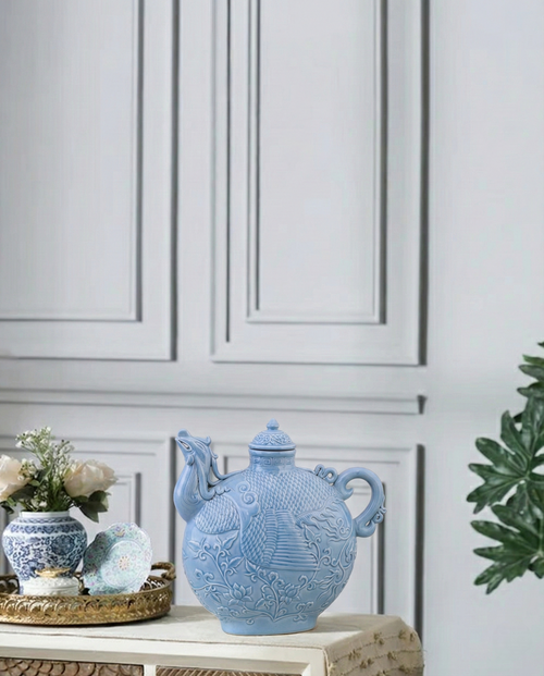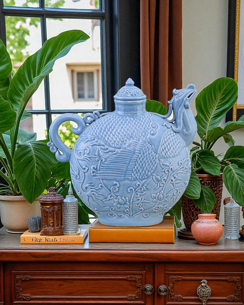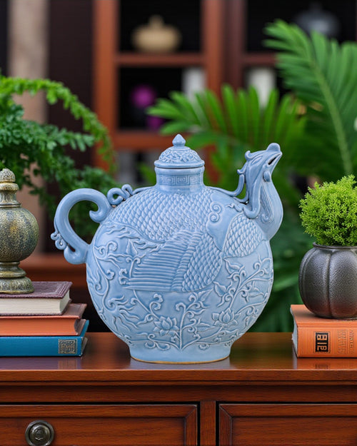 The Celestial Blue Celadon Phoenix Lidded Moon Vase showcases exquisite craftsmanship with intricate dragon phoenix embossed on a glossy sky blue hue. Perfect as a statement décor piece, it brings a regal and antique charm to living rooms, display cabinets, or traditional settings.