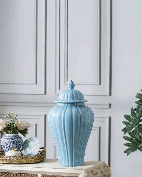 The Turquoise Ribbed Elegance Porcelain Temple Jar showcases timeless artistry with its ribbed detailing and glossy turquoise finish. Traditionally used as a symbol of prosperity and beauty, this temple jar is perfect for enhancing console tables, entryways, or living room décor.