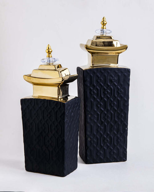 Elevate your home with our range of timeless accent pieces. The lidded jar has a square body and a geometrical motif over its surface - adding to the sophisticated charm. The jar features a tassel-lid that adds to its aura. Place it on a console or use it as an accent piece for your coffee table and create a focal point that will get heads to turn!