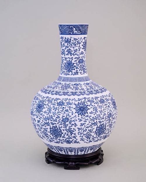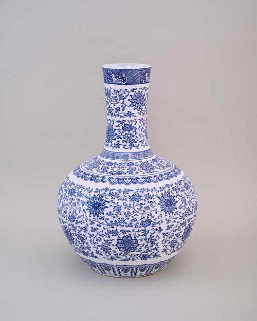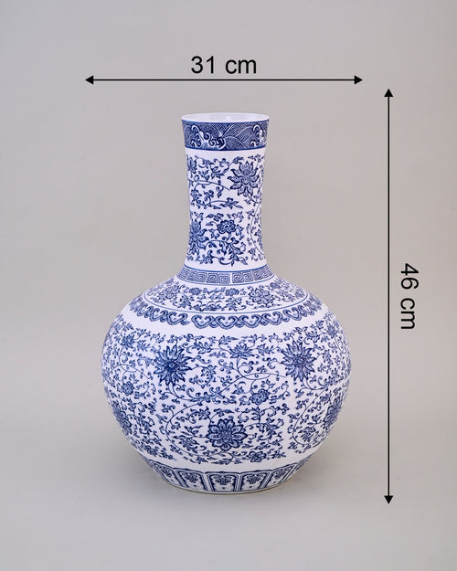 The timeless tranquillity of Oriental ceramics finds fresh expression in this traditional porcelain vase. The fluid design wraps around the jar's shapely silhouette and lends subtle beauty with its intricate strokes. Artisans paint the graceful motifs by hand, then hand-fire it for a unique finish and long-lasting beauty. Handmade in the Qing Hua Ci tradition, the porcelain is strewn with hand-painted floral motifs, symbolising royalty - in timeless cobalt blue.