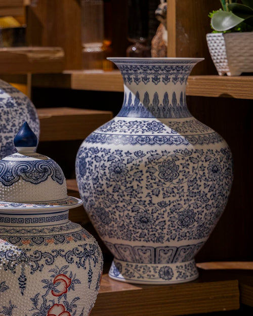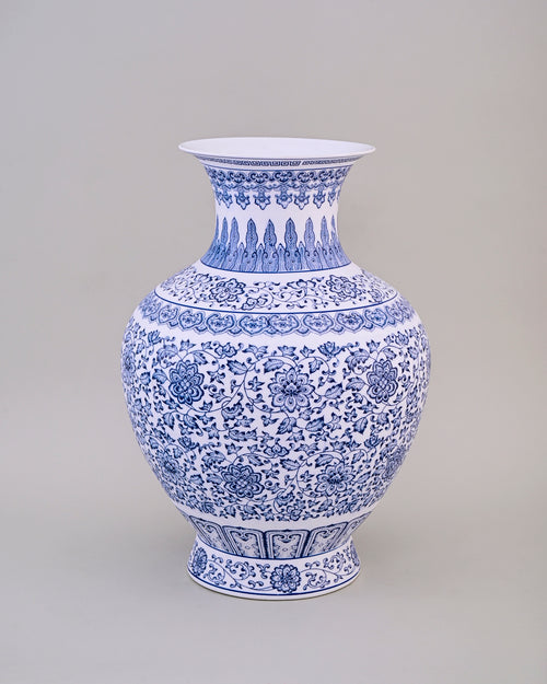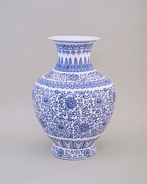 The timeless tranquillity of Oriental ceramics finds fresh expression in this traditional porcelain vase. The fluid design wraps around the jar's shapely silhouette and lends subtle beauty with its intricate strokes. Artisans paint the graceful motifs by hand, then hand-fire it for a unique finish and long-lasting beauty. Handmade in the Qing Hua Ci tradition, the porcelain is strewn with hand-painted floral motifs, symbolising royalty - in timeless cobalt blue.