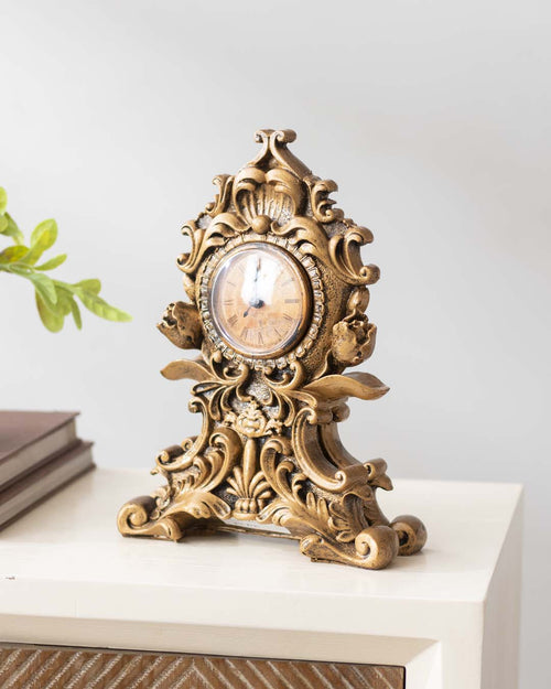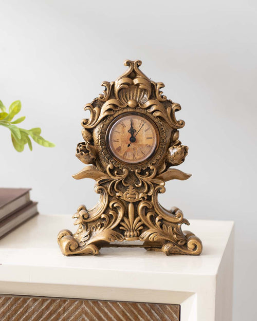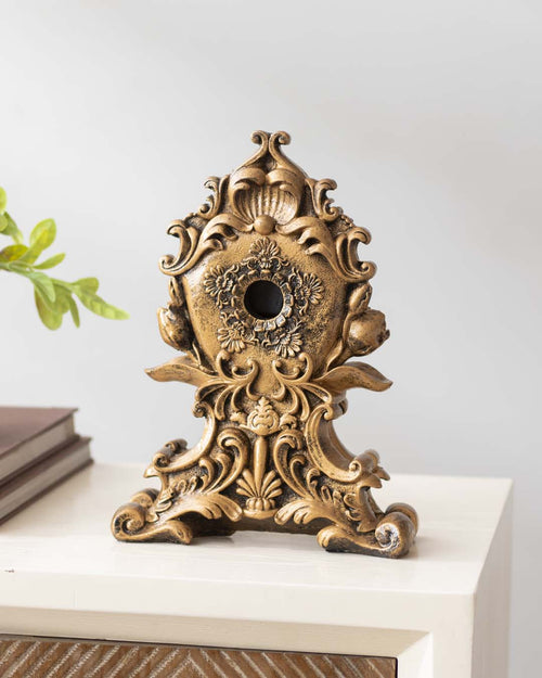 An aged aura, a vintage feel, and light undertones define this epitome of regal decor. The graceful work and intricate carvings add to the dimension and elegance. Undeniably nostalgic and charming, this timepiece also embraces charm. The clock has been hand-finished to give an aged, weathered appeal & the dial features Roman numerals on a white base!