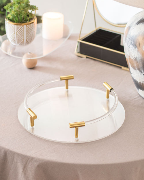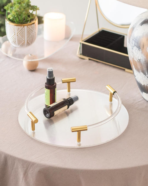 The overall design follows the classic fully transparent rectangular shape and the simple and stylish golden handle design, which is perfectly integrated with your home, making your home look more tidy and attractive, and it will also attract friends and family love. Perfect for makeup table tray, nightstand tray, coffee, and tea snack serving tray, even use for bathroom decoration tray. Keep your home organized. Leak-proof Design With fully sealed corners and an external curved handle design, you can easily and safely move the tray from the kitchen to the living room.