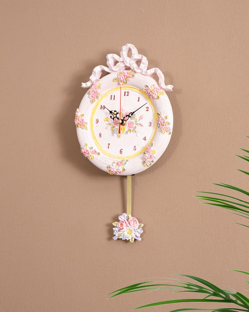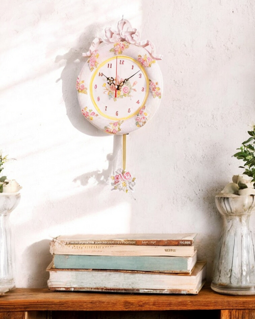 This charming vintage wall clock features a lovely rose design that is hand-painted with soft gold, pink, and green, giving it an old-fashioned appeal. The pendulum with roses at the bottom adds a perfect finishing touch.