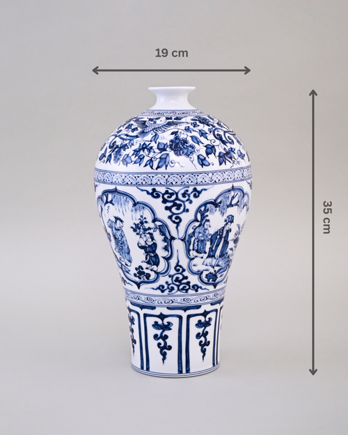This Lamp beautifully captures the essence of traditional blue and white porcelain artistry. The central panels depict a courtly or cultural scene, framed with intricate floral scrollwork. The upper section is adorned with elaborate vine and leaf patterns, while the lower part features elongated geometric floral motifs.