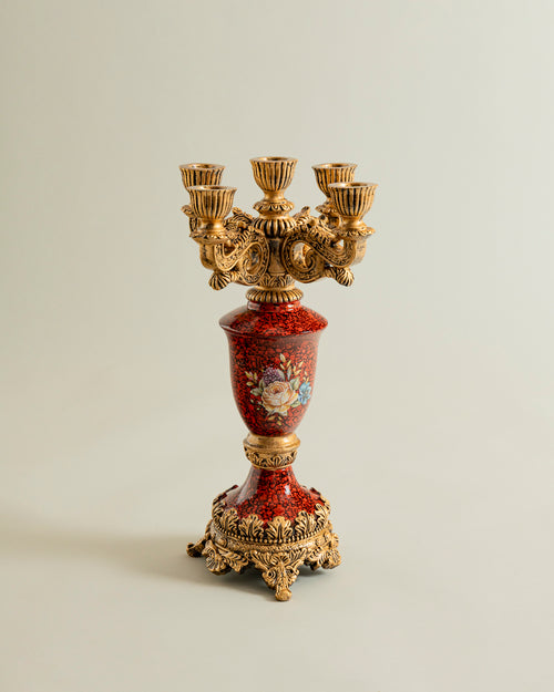 This is a stunning candle stand with beautiful floral artwork on a richly textured red background, which is complemented by an antique gold multi-arm holder. The intricate carvings on this candle stand create a regal ambiance. This is a great product to add warmth and royal elegance to dining tables or decor displays.