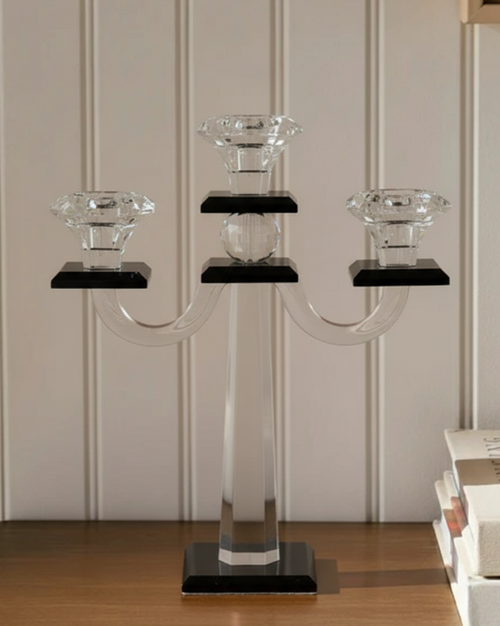 A luxurious three-arm candle stand designed with a fusion of modern geometry and timeless charm. The clear crystal holders shimmer beautifully against the sleek black and silver base, while the gracefully curved arms add balance and sophistication.