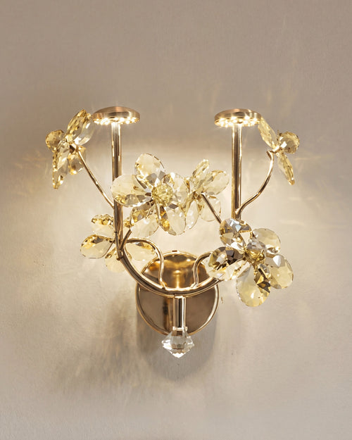 Aurelia Blossom Wall Light brings garden-inspired elegance into luxury lighting. The sculpted crystal petals catch and reflect light beautifully, creating a sparkling floral glow across the wall. The twin LED light heads add soft top illumination, while the gold-finished stems and crystal drop accent complete the regal look.
