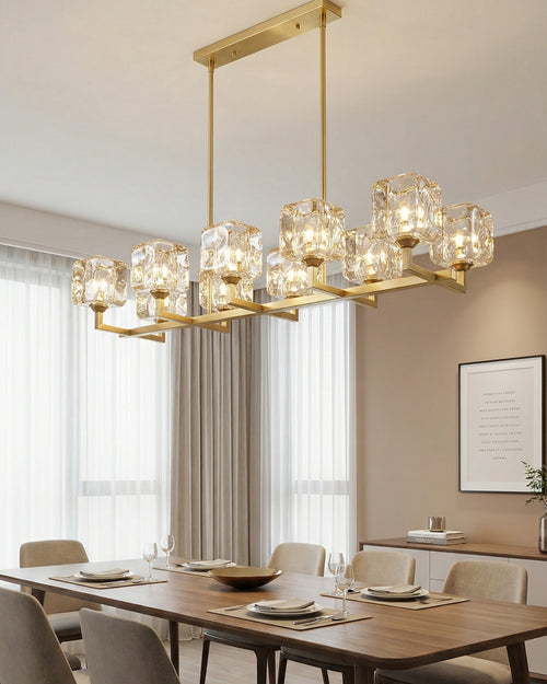 The Cube Glass Bar Chandelier features a straight gold bar fitted with clear cube-shaped glass shades that give a warm, stylish glow. Its clean linear design is perfect for dining tables and kitchen islands, adding a modern luxury look while lighting the space evenly.