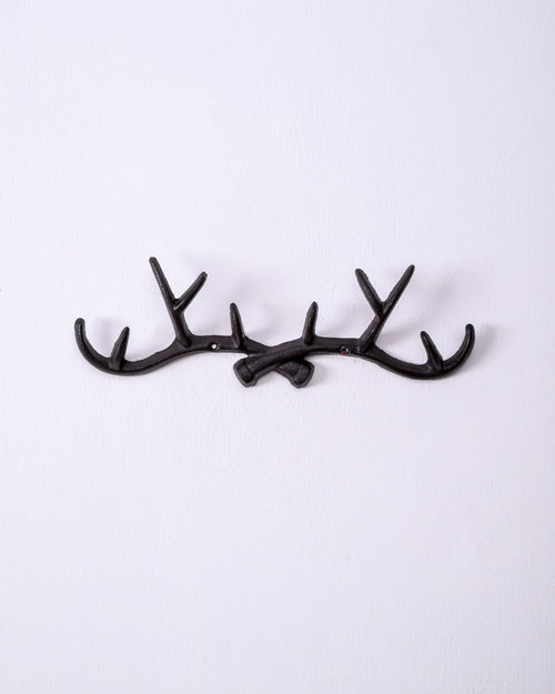 A rustic wall hook crafted from solid cast iron, designed in the shape of interlocking deer antlers. Its rugged texture and natural form bring a touch of wilderness charm to your space, perfect for hanging coats, keys, or accessories while enhancing cabin, farmhouse, or vintage-inspired interiors.