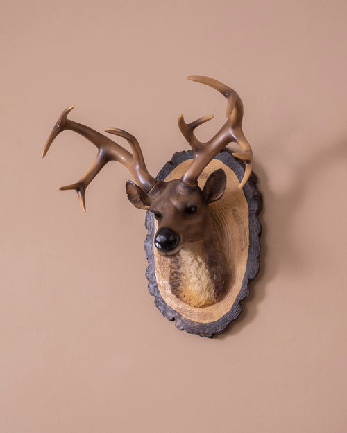 This is a wall-mounted deer head figurine with an oval wooden backing, giving it a rustic and traditional look. The deer is depicted with lifelike brown fur, detailed facial features, and large, branched antlers. The wood slice effect adds a natural, handcrafted feel.