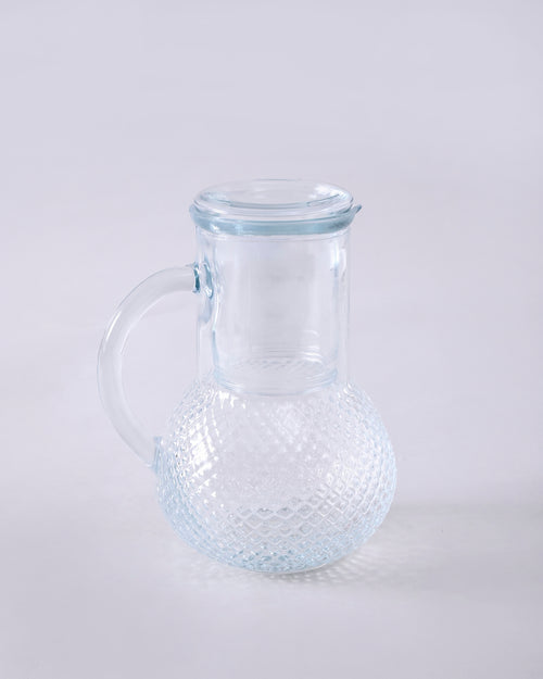 This Diamond Cut Glass Jug with Tumbler Lid is a perfect blend of smart design and modern elegance. Crafted from premium clear glass, it features a textured diamond-patterned jug with a sleek handle for easy pouring. The innovative lid doubles as a drinking glass, making it both stylish and space-efficient. Ideal for serving water, juice, or infused drinks, this multifunctional jug adds a touch of minimalist sophistication to your dining table, office desk, or bedside setup.