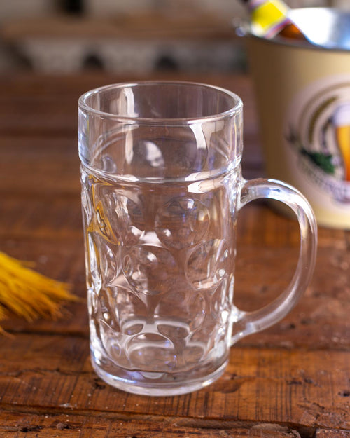 Enjoy your beer from a classic dimpled mug. This mug has a textured base with a unique pattern that adds character to every sip. Designed to keep your beer cold, it's the perfect addition to any home bar.