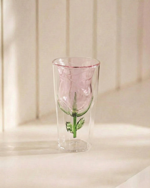 This enchanting Double Wall Rose Glass Tumbler features a delicate pink rose sculpted inside the clear glass, creating the illusion of a flower blooming within. The green stem and leaves add a natural, artistic touch, making it both elegant and romantic. Perfect for serving beverages or as a decorative showpiece, this tumbler combines artistry and craftsmanship in a timeless floral design.