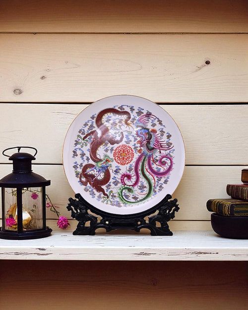This elegant porcelain plate features the legendary Dragon and Phoenix, powerful symbols of balance, unity, and prosperity in Chinese tradition. The dragon represents strength and authority, while the phoenix embodies grace, beauty, and rebirth. Surrounding them are intricate cloud motifs and a central medallion with auspicious patterns, all rendered in vibrant colors.