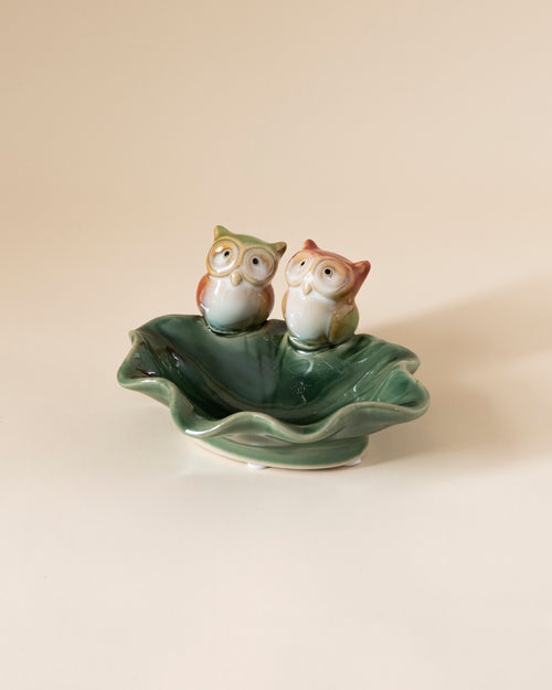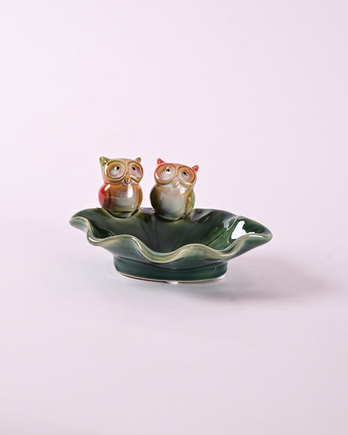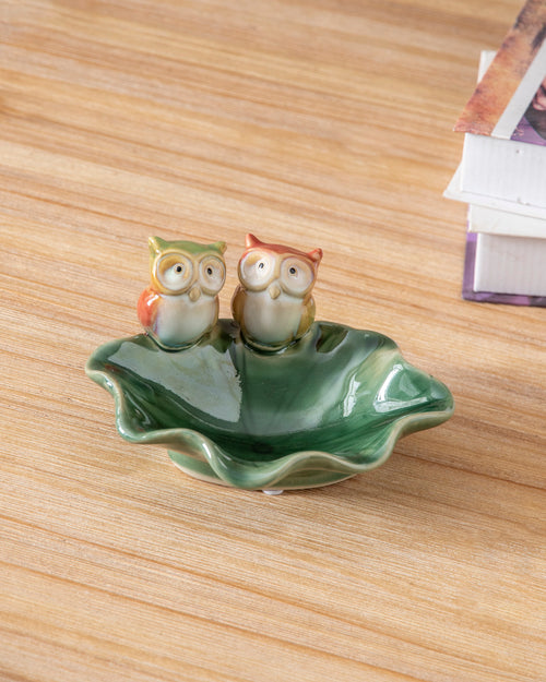 This is a charming mini ceramic platter featuring two small, perched owls on the edge of a leaf-shaped dish. The owls have a glossy, multicolored glaze with warm earthy tones, giving them an adorable and handcrafted look. The leaf-shaped dish has a wavy, organic form with a rich green glaze
