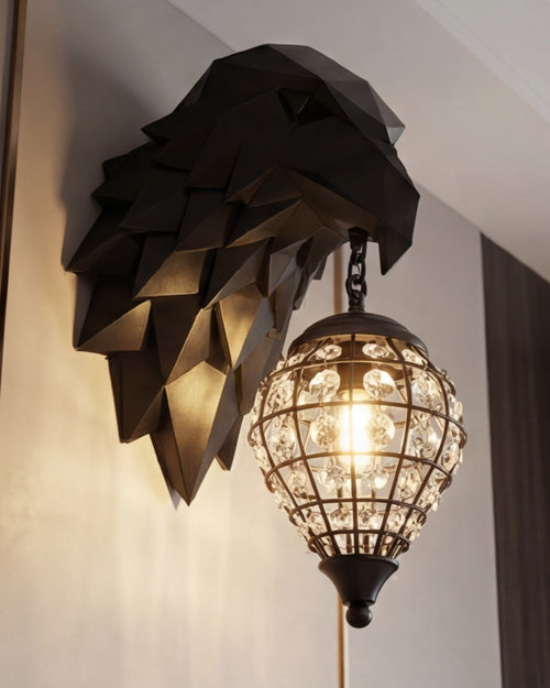 The Eagle Head Wall Light features a bold metal eagle head mounted on the wall, holding a hanging cage-style glass lamp. It gives a warm, dramatic glow and works great as a feature light for living rooms, cafés, bars, and statement walls, adding a strong decorative and artistic look.