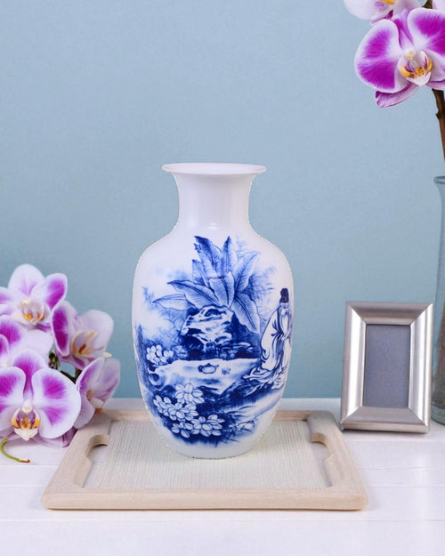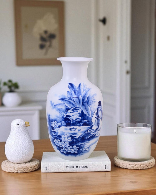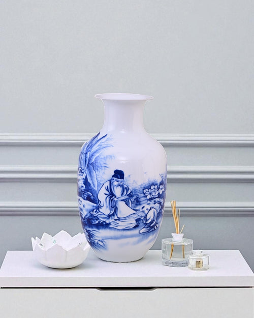 This elegant vase is crafted in classic blue and white Bone China style, showcasing traditional hand-painted artwork. The design depicts an elderly wise man under a tree, surrounded by nature, symbolizing wisdom, peace, and longevity.