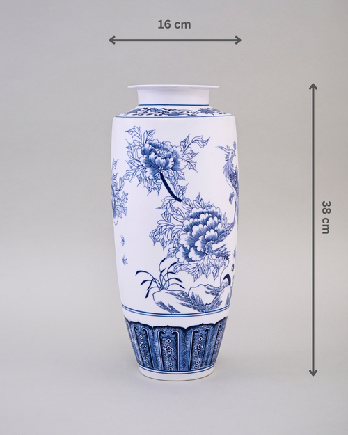 This vase features intricate blue floral motifs with gracefully painted birds, symbolizing beauty, prosperity, and harmony. The detailed lower border adds an extra touch of sophistication, making it a perfect centerpiece for modern as well as traditional interiors. Ideal for displaying fresh flowers or as a standalone décor piece, it brings timeless charm and elegance to any space.