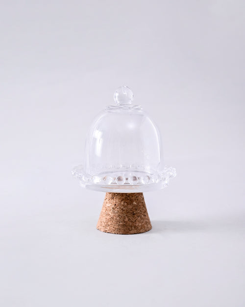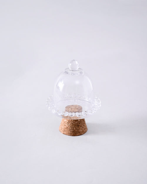 This Elegant Glass Dome Butter Dish blends modern minimalism with classic charm. It features a clear glass cloche cover with a delicate beaded edge base resting on a natural cork stand, creating a perfect balance of texture and transparency.
