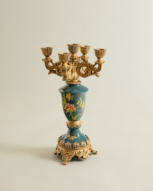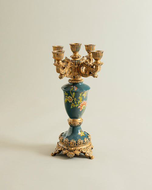A beautiful candle stand with intricate floral designs on a stunning emerald base, perfectly accentuated by an elaborate antique gold multi-arm holder. The intricate details and sculpted pedestal give it a regal, vintage look. Ideal for enhancing dining tables or decorative settings, this candle stand adds a touch of elegance and sophistication.