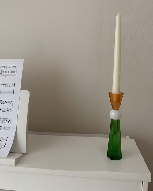 A striking crystal candle stand featuring a bold geometric silhouette with a glossy green base, frosted white orb center, and amber-tinted cone top. The fusion of colors creates a vibrant, contemporary appeal blending elegance with artistic flair.