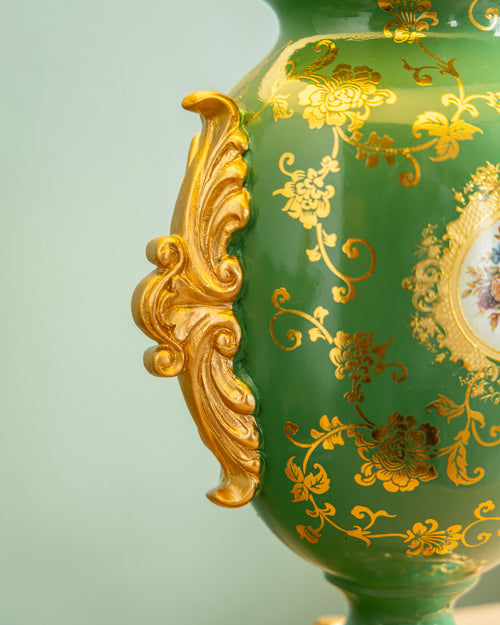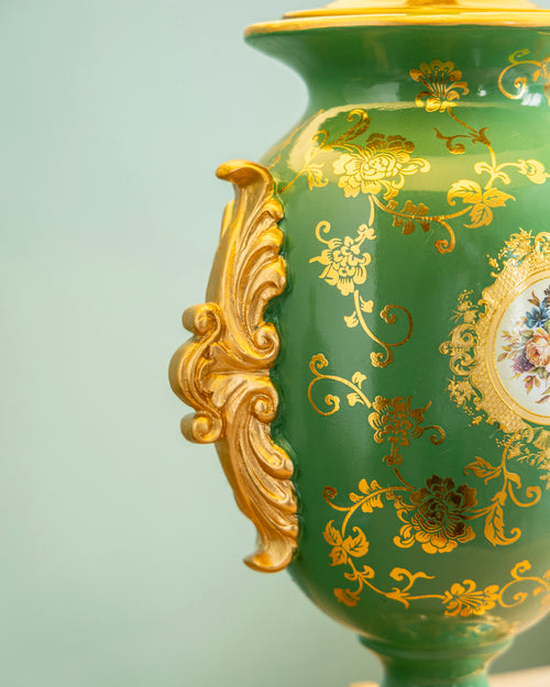 Add a touch of classic sophistication to your space with this beautifully crafted table lamp, featuring a rich emerald-toned base highlighted with intricate gold detailing and a central medallion design.