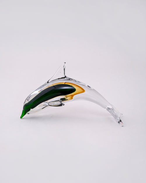 Celebrate the beauty of the ocean with the Emerald Wave Dolphin Figurine, a masterpiece of artistry and elegance. Crafted from crystal-clear glass with a flowing blend of emerald green and golden hues, this figurine captures the graceful motion of a dolphin gliding through sunlit waters.
