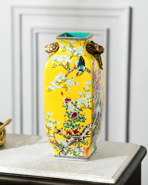 A vibrant square-shaped enamel vase featuring detailed floral and bird artwork set against a striking yellow background. The sculpted brass ram-head handles add an antique luxury touch, making it a standout décor accent.
