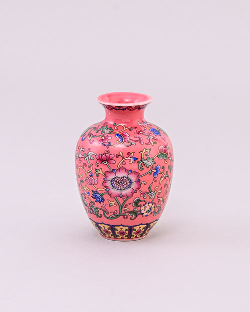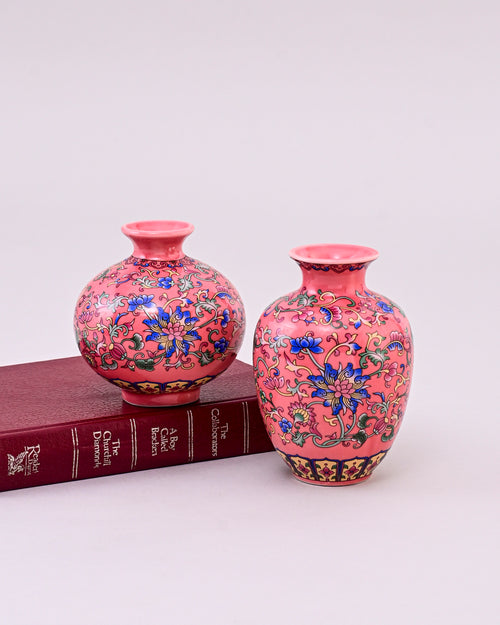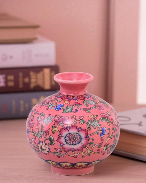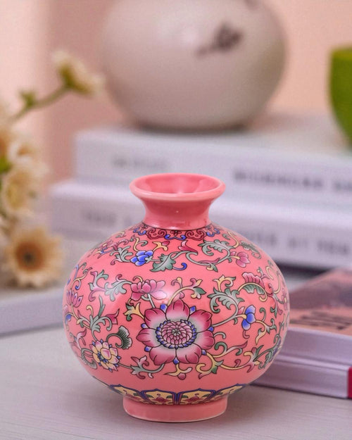 The Famille Rose Blossom Vase Set is a stunning collection of three ceramic vases, hand-painted in the classic Famille Rose style. With a soft pink background adorned with colorful floral motifs, each vase represents elegance, harmony, and cultural artistry.