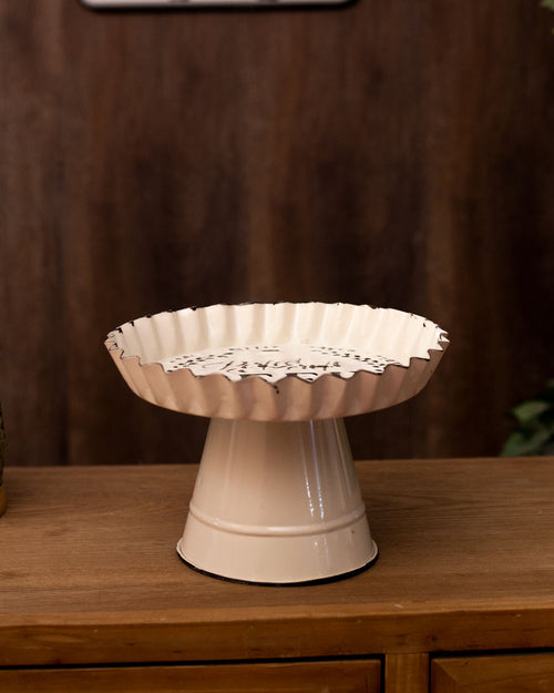 This rustic farmhouse-inspired pedestal server features a lipped edge tray and a weathered white finish. It's perfect for catching knick-knacks and small items around your kitchen or for using as the base of a beautiful cake. Accent your kitchen with style.