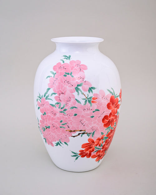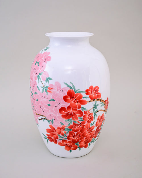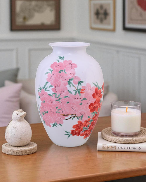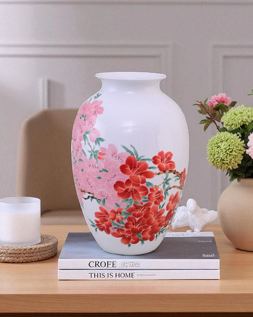The Fencai Blossom Bone China Vase is a graceful Bone China piece featuring hand-painted floral motifs in soft pink and vibrant red hues. Symbolizing prosperity, harmony, and natural beauty, the blossoms bring a refreshing charm to its glossy white base.