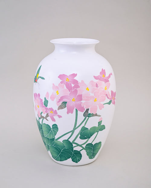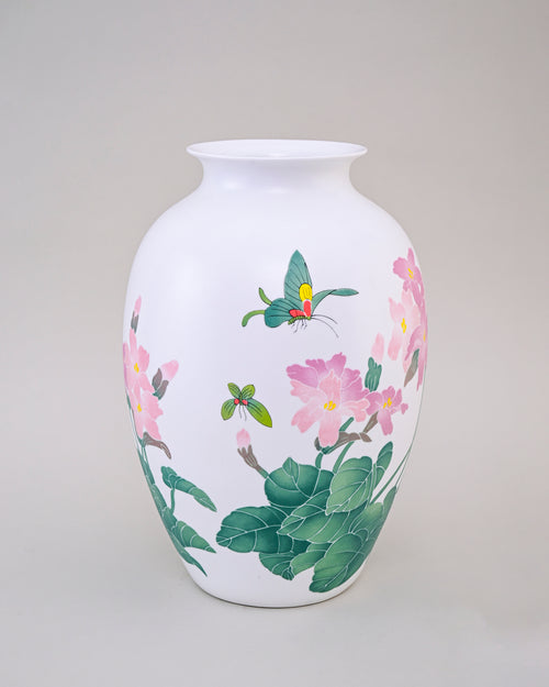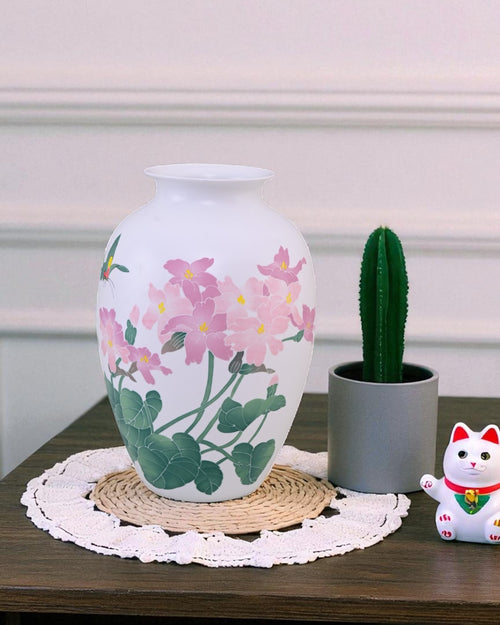 The Fencai Pink Blossom Bone China Vase features delicate hand-painted pink flowers with fresh green leaves, symbolizing beauty, grace, and new beginnings. Designed in the traditional Fencai porcelain style, it brings a soft and refreshing charm to any space.