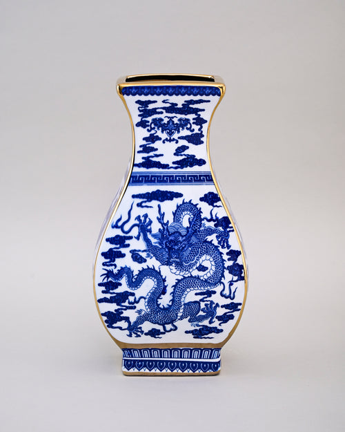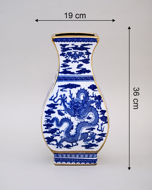 This striking vase features a bold depiction of a dragon amidst swirling clouds, symbolizing strength, protection, and prosperity. Painted in cobalt blue on a white porcelain base, the design is further elevated with golden edging that adds a regal touch.