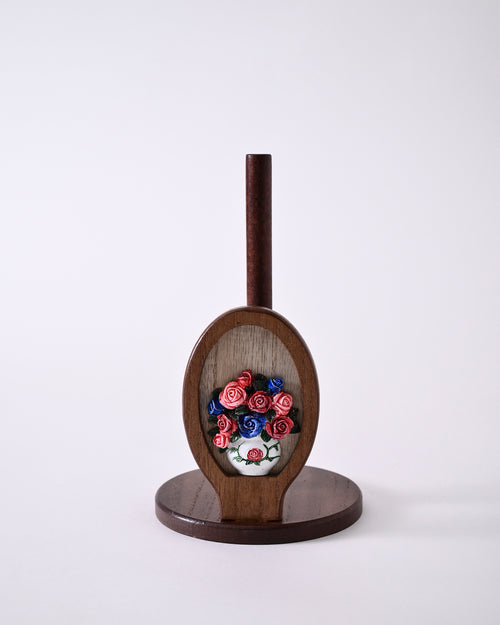 This elegant wooden paper towel holder features a smooth round base and sturdy vertical stand, paired with a charming floral accent plaque for a decorative touch. Its handcrafted design adds warmth and style to any kitchen or dining space while keeping your paper towels easily accessible and neatly organized.