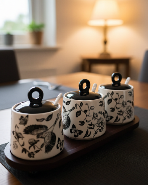 This elegant ceramic condiment jar set features three beautifully designed jars with matching lids and spoons, placed on a sturdy wooden tray. Adorned with delicate floral patterns, it brings a touch of sophistication and charm to your kitchen or dining space. Perfect for storing spices, sugar, salt, or chutneys, this set blends functionality with timeless elegance, making it an ideal choice for everyday use or special gatherings.