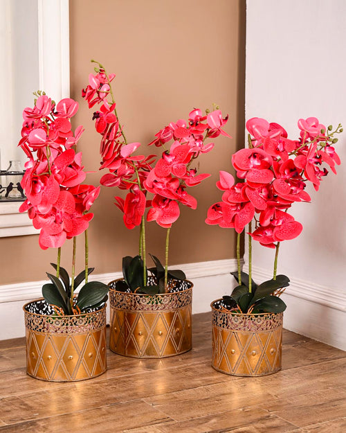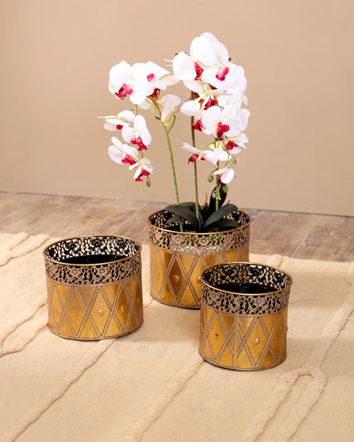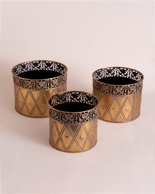 These embossed metal planters combine artistry with durability. The antique tone and intricate floral motifs add sophistication to any room or garden. Their weathered metallic finish evokes timeless elegance, perfect for complementing both modern and vintage interiors
