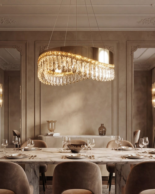 The Gildora Veil Crystal Chandelier features a polished golden ring wrapped in cascading teardrop crystal elements that create a rich curtain of light. Its refined circular form adds graceful movement and sparkle to formal living rooms, grand dining areas, and luxury interiors, delivering timeless elegance with a contemporary edge.